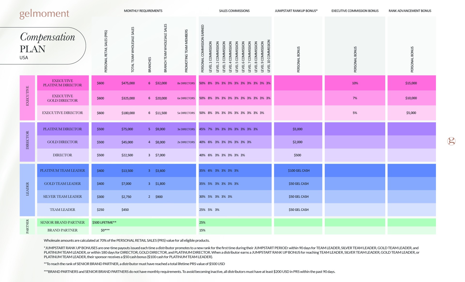 Our RANK PERKS AND RECOGNITION PROGRAM is designed to reward you as you achieve a new rank at gelmoment. Exclusive gifts, generous cash bonuses, enhanced and additional support and free trips are just a few of the incredible perks available that reward your growing gelmoment business.